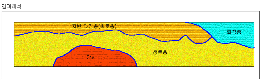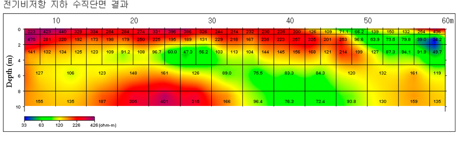 - 지표에서부터 지하 약 2m 깊이 사이의 높은 비저항값을 가지는 곳은 건물을 짓기 위한 지반 다짐층(축토층)으로 생각되며, 지하 7m 이하의 높은 비저항값을 가지는 곳은 암반층으로 추정된다.
